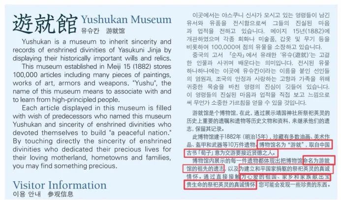 在靖国神社内部,有一个战争博物馆,就是臭名昭著的游就馆。 游就同样用了我们的典故——荀子的《劝学篇》: 故君子,居必择乡,游必就士。所以防邪僻,而近中正也。 意思是: 居住和郊游要选择正确的地方、正确的人,这样才能走正道. 游就馆 是 靖国神社 内的一个 战争 博物馆 ,成立于1882年( 明治 15年),是日本最初,历史最悠久的军事博物馆。 游就馆展览的主题是战争,主要有日本在近代战争中所使用的武器、军人遗品、战时资料等约10万件,军人遗照约5000张。 靖国神社里的游就馆为日本的侵略战争辩护成自卫。 (蔡虹 摄) 中国日报东京8月13日电 (记者 蔡虹)每当被别国批评对其在二战时侵略亚洲国家不进行反省和道歉时,日本总是备感委屈。 ——游就馆内对太平洋战争的描述。 真的无耻。 不过,这也让人疑惑: 原来靖国神社里的东西这么荒谬,那以前怎么没听说过呢? 这正是日本政府的有意为之。 03.